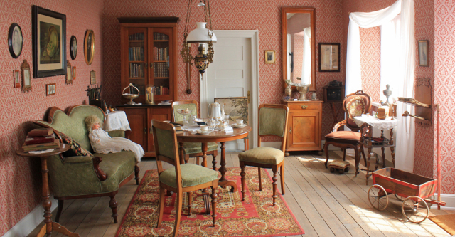 It is like entering great grandfather`s livingroom with period wallpaper, muslin curtains, mahogany furniture, pipe rack, harmonium, lace pillow, porcelain table arrangement, silverware and old family portraits on the wall.